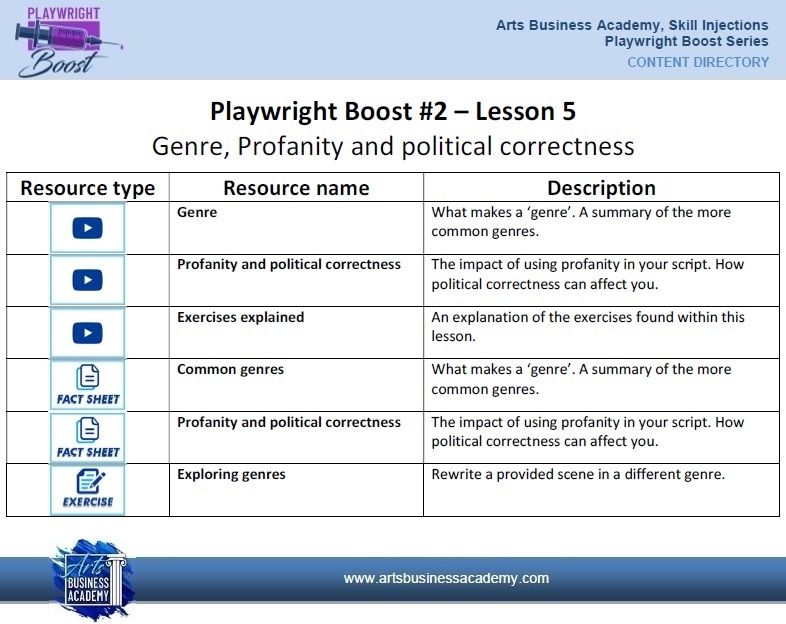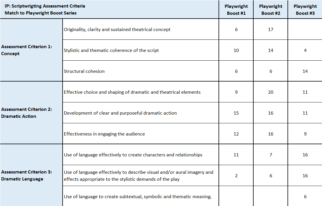 We matched the Playwright Boost Series content, exercises and resources to the IP: Scriptwriting assessment criteria.