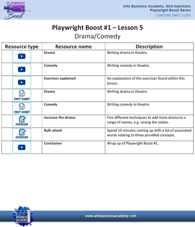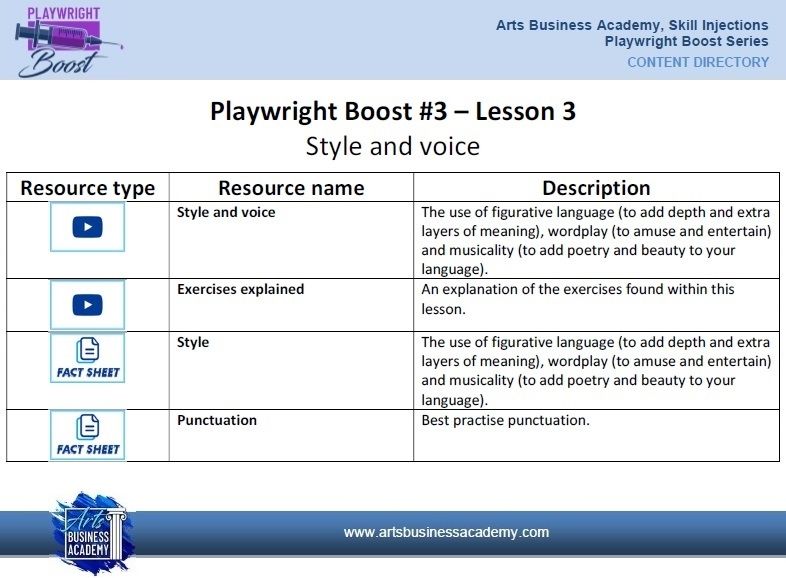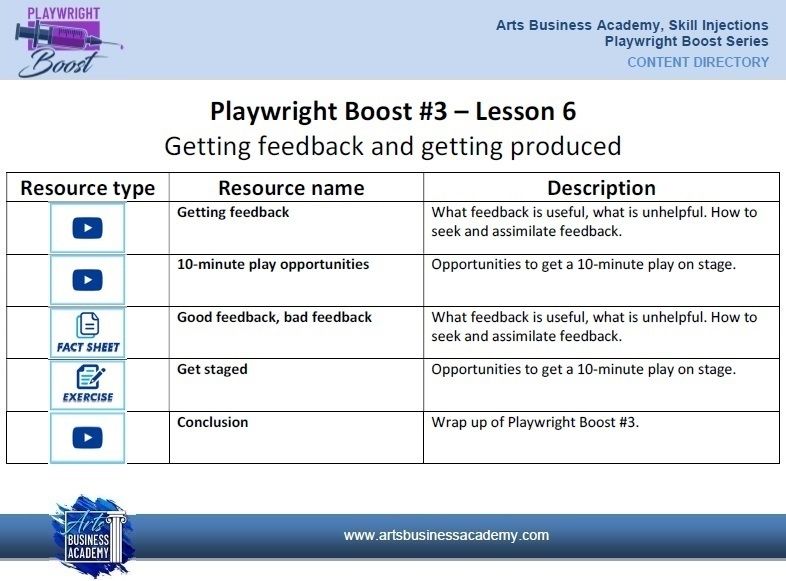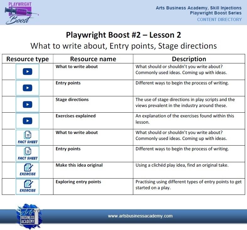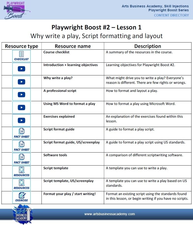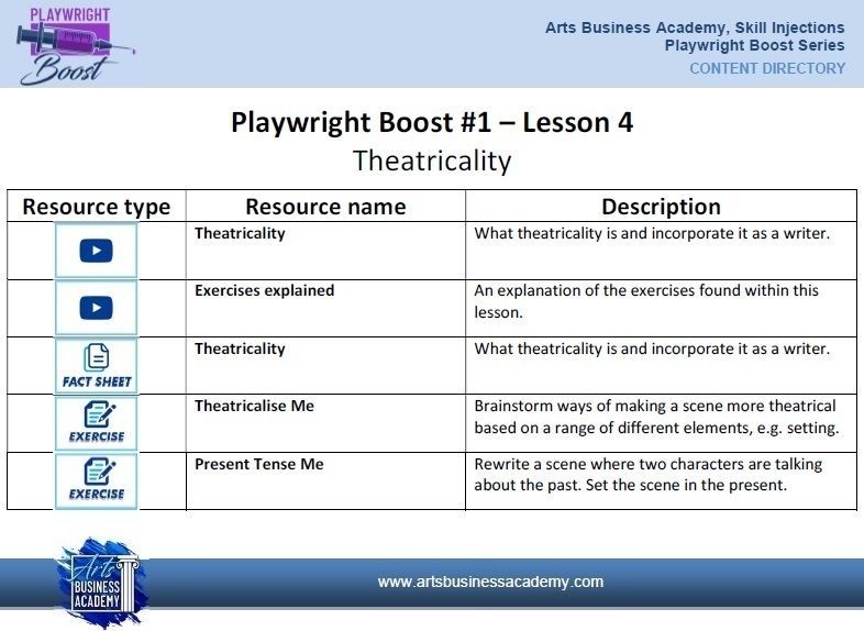 Our members get access to Playwright Boost Writing Series developed by Arts Mastery. This is a 17-week, 3-part playwriting course that gives you everything you need to know about writing a play.