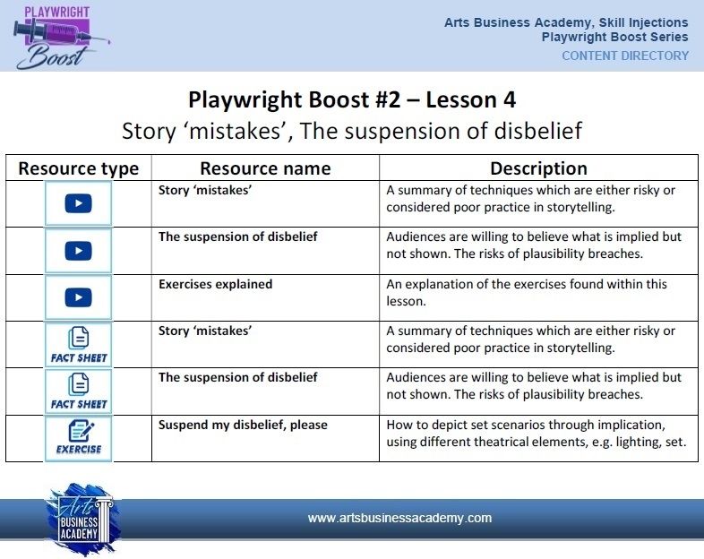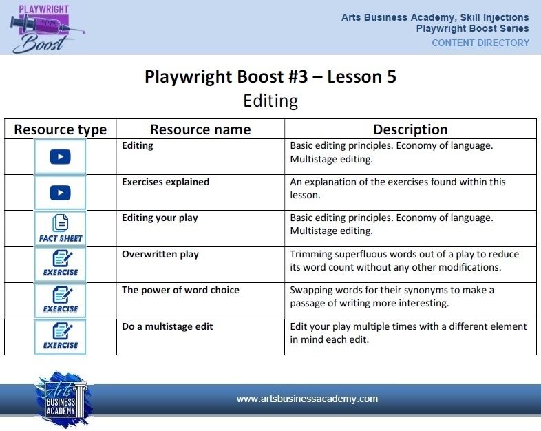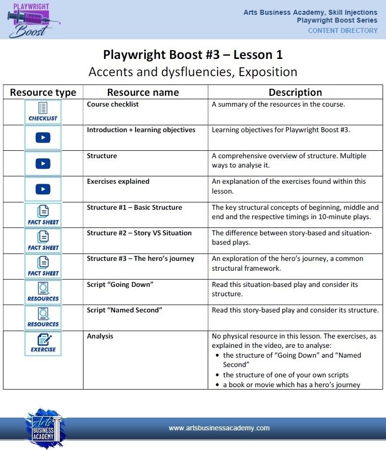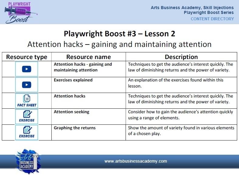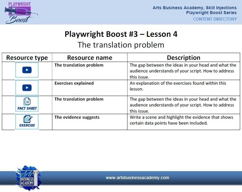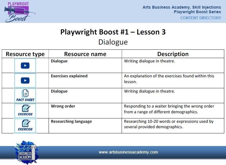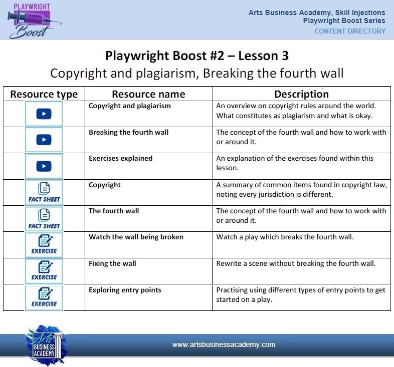 Our members get access to Playwright Boost Writing Series developed by Arts Mastery. This is a 17-week, 3-part playwriting course that gives you everything you need to know about writing a play.